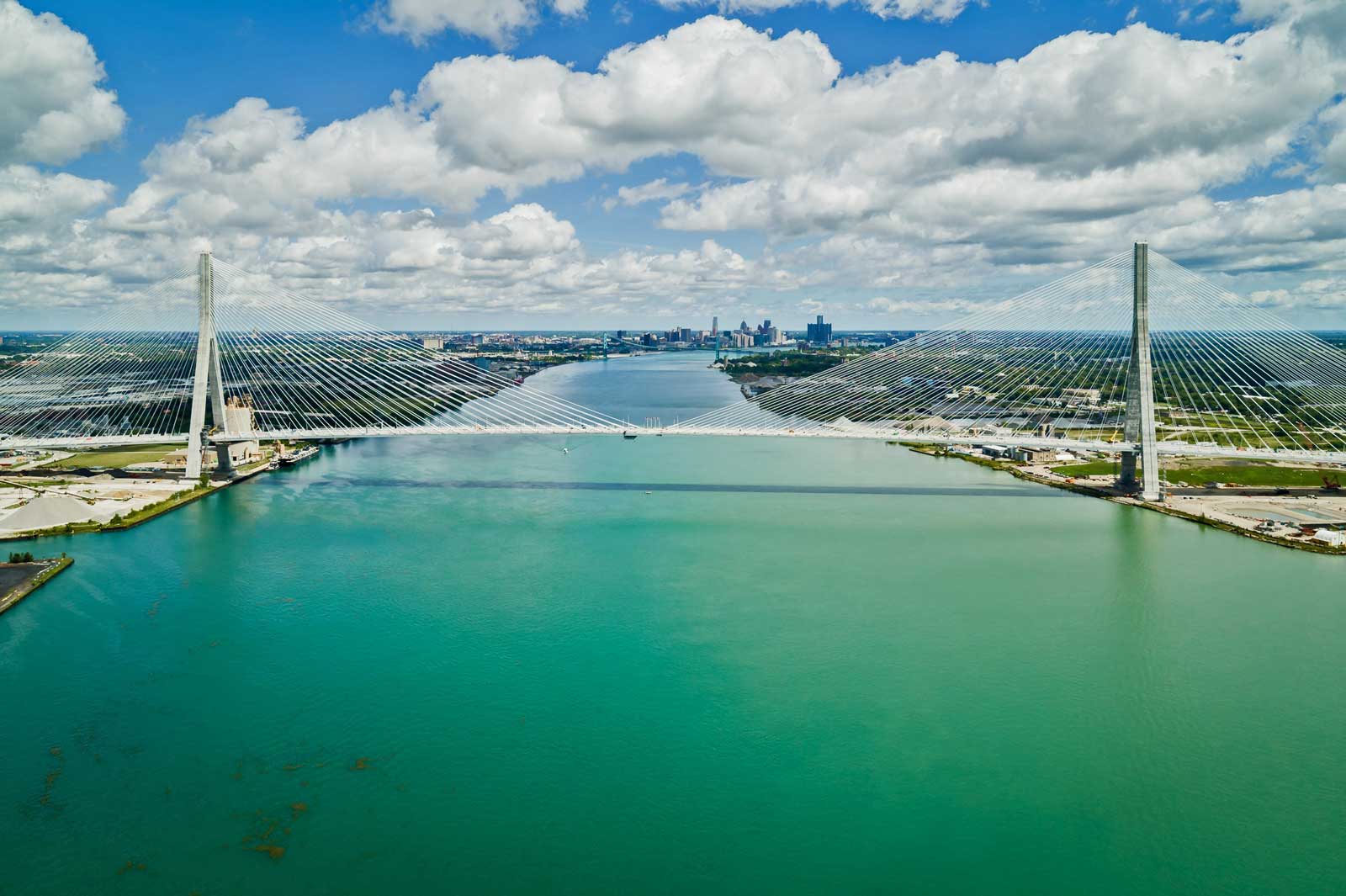 Gordie Howe Bridge ELS Aerial from River 2025 [Michigan Left - Ontario Right]